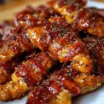 Crispy chicken tenders wrapped in bacon and coated in a sweet brown sugar glaze for a deliciously indulgent experience.