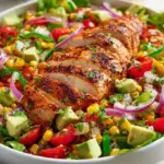 A vibrant and wholesome grilled chicken salad, packed with fresh veggies and a zesty homemade dressing perfect for summer picnics.