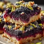 These delightful bars feature a creamy blackberry filling complemented by a crunchy pistachio topping, all nestled in a rich buttery crust.
