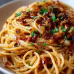 The very act of cooking this dish feels like a charming ritual. The onions slowly caramelize in golden, bubbling olive oil, turning from crisp, white slivers to deep, rich brown strands that glisten with sweetness. You stir in minced garlic, adding another layer of warmth, as the sizzling sound resonates around you. Just when you think it couldn’t get better, you introduce a homemade chili oil that sings with spice and character, ready to ignite your taste buds like a burst of fireworks on a summer evening. Each forkful of this pasta sensation carries the perfect balance of sweetness, heat, and richness—an invitation you simply cannot resist.