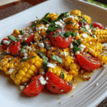 A refreshing salad combining sweet corn, juicy tomatoes, and tangy feta cheese, perfect for summer gatherings.