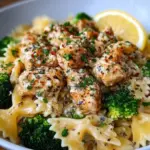 A rich and comforting dish featuring bowtie pasta, juicy chicken, and crisp broccoli in a creamy, buttery lemon sauce.