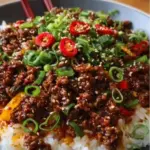Imagine sitting down to a plate heaped with fluffy rice, topped by a generous serving of sizzling, slightly caramelized beef that glistens under the soft glow of dinner lights. The dish feels vibrant, adorned with bright spring onions and sesame seeds that crunch and pop to life. The concoction emits an irresistible scent that tells stories of hearty dinners, laughter echoing in the air, and meals shared with loved ones around a bustling table. Dive into this recipe, and you’ll savor the raucous joy and soul-soothing comfort that only a homemade meal can provide. Each component plays a vital role in creating a symphony of tastes, textures, and aromas that transports you straight to foodie heaven.