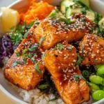 - Assemble the bowls: Divide cooked rice into bowls, top with crispy salmon, avocado, cucumber, shredded carrots, and edamame.
