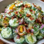 A refreshing summer salad featuring crisp cucumbers, juicy cherry tomatoes, creamy ranch dressing, and a delightful crunch from bacon and cheddar cheese.