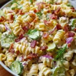 A delightful pasta salad combining crispy bacon, creamy dressing, and the zesty freshness of dill pickles.