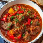 A comforting and hearty lamb stew enriched with red bell peppers, spices, and caramelized onions, perfect for cozy dinners or special occasions.