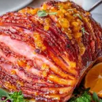 A beautifully glazed ham that combines smoky-salty flavors with sweet caramelized sugars and zesty citrus notes, perfect for holiday gatherings.