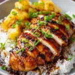 Serve and Garnish: Plate a generous mound of coconut rice, place the succulent chicken on top, and finish with sweet pineapple slices and a sprinkle of chopped green onions for a burst of color and flavor.