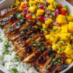 - Assemble bowls with coconut rice, sliced chicken, and mango salsa.