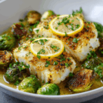 A delicious and healthy dish featuring cod fillets cooked in a lemon garlic butter sauce, served with roasted Brussels sprouts.