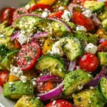 A bright and fresh Mediterranean avocado salad that combines creamy avocados, juicy cherry tomatoes, crunchy cucumbers, and tangy feta cheese, all dressed with olive oil and lemon juice.