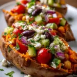 Delicious roasted sweet potatoes stuffed with a vibrant Mediterranean filling of fresh vegetables and chickpeas.