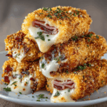 Delicious and crispy ham and cheese sticks that are perfect for snacking or as an appetizer.