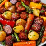 A delightful one-pan meal bursting with flavor from juicy kielbasa and colorful veggies, all glazed in a sweet honey-garlic sauce.