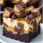 Irresistible brownies layered with a creamy peanut butter cheesecake topping, featuring chunks of Reese’s Cups for added flavor.