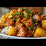 Succulent chicken, sweet and tangy pineapple, all cloaked in a luscious sauce for a delightful tropical meal experience.