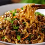 A comforting bowl of Lo Mein noodles, ground pork, and crunchy coleslaw in a savory sauce, perfect for cozy dinners or impressing guests.
