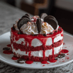 A delicious and visually stunning dessert that combines layers of red velvet cake, creamy cheesecake filling, and crunchy Oreo cookies.