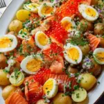 The creamy richness of perfectly boiled eggs finds harmony with the subtle crunch of shallots and the unexpected bursts of briny salmon roe. As you stir together the colorful ingredients, the anticipation builds for something truly special. Your mouth waters at the thought of how simple ingredients can unite to create a dish that feels both elegant and comforting. With its vibrant hues and aromatic allure, this Smoked Salmon Potato Salad isn’t just food—it’s an experience that delights the senses and warms the heart.