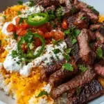 Divide your beautifully cooked rice among serving bowls as though setting the stage for something remarkable. Lay the succulent steak strips over the rice, and don’t hold back on the queso sauce—drizzle it generously, allowing it to cascade down like a velvety waterfall.