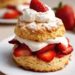 A delightful dessert featuring flaky biscuits layered with fresh strawberries and whipped cream, perfect for spring and summer gatherings.