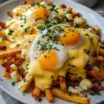 A cozy, indulgent breakfast featuring crispy fries, gooey cheese curds, poached eggs, and rich hollandaise sauce.